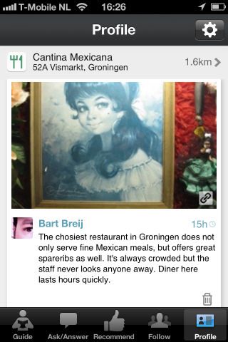 Als je wilt weten wat een leuk restaurant in Beilen is, kun je dat wel als vraag stellen in het tabblad Ask/ Answer. Daar verzamelen de laatste vragen van jou en je vrienden zich onder de subcategorieën eigen vragen, vragen van vrienden en alle vragen die worden gesteld in de app. Vreemd genoeg ontbreekt bij die laatste subcategorie een mogelijkheid om op nabijheid te sorteren. Zo krijg je net zo goed een vraag te zien over een visrestaurant in Vietnam als een gezellig eettentje in Almere.