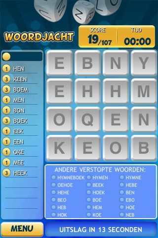 De woorden die je maakt in Woordjacht, moeten voortkomen uit blokken die recht of schuin naast elkaar liggen. De introductie van Boggle (met “Mr. Boggle” Frank Kramer, zie video hieronder) legt dat nog duidelijk uit. Voor elk woord van drie letters krijg je een punt. Voor alles daarboven loopt de score hoog op. Bovenin het scherm zie je hoeveel punten er in totaal te halen zijn. Aan het einde van het spel staan de scores van spelers onder elkaar en zie je hoeveel procent van de geraden woorden iedereen heeft gehaald. Zodra je begint te spelen, wordt je meteen in een bezige online pot geworpen en kun je direct beginnen. Na het scorescherm start het nieuwe potje alweer in enkele seconden. Woordjacht is een vlot spel.
