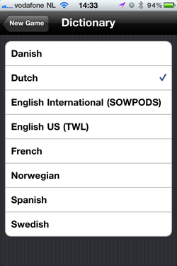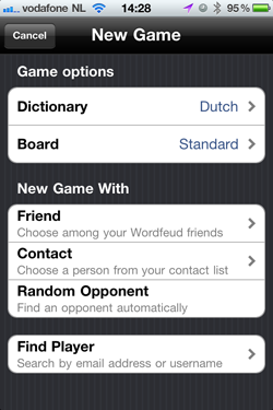 Wanneer je een potje Scrabble (of beter: Wordfeud) wil beginnen druk je op de Plus-knop, rechtsboven in de app. Daar krijg je de optie om uit meerdere talen te kiezen (Nederlands, Deens, Engels, Frans, Noors, Spaans en Zweeds) en is het ook mogelijk om het soort spelbord te genereren. Kies voor ‘Standard’ voor een traditioneel Scrabble-bord met puntenverdubbelaars op de gewoonlijke plaatsen, of voor ‘Random’ waardoor de puntenverdubbelaars totaal willekeurig op het bord zijn geplaatst. Voor het uitdagen van een tegenstander kun je een van je Wordfeud-vrienden selecteren, een willekeurige andere speler opzoeken of een uitnodiging om de app te downloaden naar een van de personen in je contactlijst sturen. Er is helaas geen koppeling met sociale netwerken of Apple’s eigen Game Center.