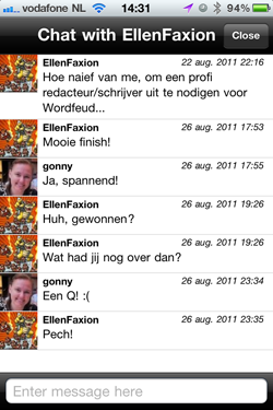 Wanneer je een woord hebt gelegd, kun je wachten totdat je tegenstander dat ook weer doet. Heb je echter belangrijker zaken te doen, dan kun je de app ook afsluiten en er later weer naar terugkomen. Zodra het jouw beurt is krijg je dit via een pushbericht te weten, mits je push notificaties voor Wordfeud hebt ingeschakeld. Vooral daarin zit de kracht van Wordfeud: je bent hierdoor namelijk niet aan een bepaald tijdstip gebonden om te gaan spelen, maar bepaalt zelf wanneer je er tijd in steekt. Neem alleen niet téveel tijd om na te denken, want maak je 72 uur lang geen zet, dan verlies je het spel automatisch. Tijdens het spelen kun je via een chatfunctie ook praten met je tegenspeler. Hiervan krijg je geen pushbericht, maar als de ander de app weer opstart zie je met een badgenummer dat er een chatbericht klaar staat.