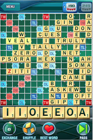 Wanneer je enkel met een Nederlands woordenboek wil spelen, is de keuze voor Wordfeud een makkelijke. Zynga’s Words With Friends en EA’s officiële Scrabble-app bieden namelijk alleen een Engelse woordenlijst. Helaas is EA’s officiële app weer niet online te spelen. Er is een Wi-Fi-modus en de mogelijkheid om op dezelfde iPhone of iPad te spelen, maar bij beide wordt verwacht dat de tegenstanders bij elkaar in de kamer zitten. Deze lokale multiplayer wordt wel leuker wanneer je de iPad-versie van het spel en meerdere iPhones hebt. Door daarop de gratis Scrabble Tile Rack app te downloaden is het namelijk mogelijk om je iPhone als letterhouder te gebruiken voor de iPad.