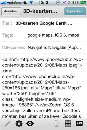 De iPhone-app bevat ook nog wat verbeteringen, zoals iets gewijzigde kleuren en graphics. Maak je gebruik van berichtformaten (bijvoorbeeld ‘Standaard’), dan ondersteunt de app die voortaan ook. De WordPress-app ontwikkelt zich langzaam maar zeker en wordt daarbij steeds bruikbaarder. Toch is er een reden waarom we de app bij iPhoneclub nog niet gebruiken om artikelen te schrijven: de knoppen in de normale webinterface voor bijvoorbeeld de More-tag zijn niet beschikbaar in de app. Dus daarvoor zul je alsnog naar de browserversie moeten gaan of de code handmatig intikken. Voor het aanpassen van al gepubliceerde berichten is de app wel handig. En ook het modereren van reacties is via de app prima te doen.