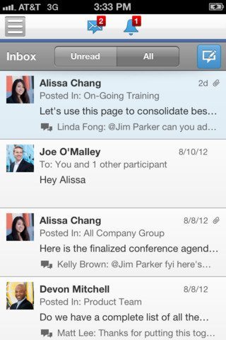 Het zakelijk georiënteerde sociale netwerk Yammer heeft vrijdagavond een update voor haar gelijknamige iOS-applicatie uitgebracht. In de laatste update (5.1) introduceert het bedrijf vooral functies om eenvoudiger op de hoogte te kunnen blijven van wat er binnen jouw netwerk speelt. De grootste vernieuwing is Inbox, waarin voortaan niet alleen privéberichten terug te vinden zijn maar ook gewone conversaties. Eerder dit jaar kreeg de Yammer-applicatie ook al een volledig nieuw ontwerp.