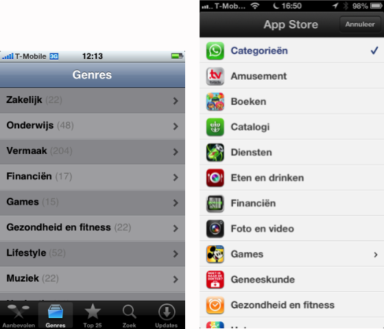 Apple wisselt sinds de introductie van de App Store steeds de manier waarop applijsten getoond worden. In 2008 toonde de App Store een verticale lijst met applicaties op nagenoeg iedere plek: bij de toplijsten, op de Uitgelicht-pagina en bij iedere categorie. Vanaf het redesign in iOS 6 is Apple daar van afgestapt. Apps staan horizontaal naast elkaar, waardoor je er minder in één keer ziet en opzij moet vegen om door de lijst te navigeren. Door op ‘Bekijk alles’ te drukken krijg je alsnog een verticaal overzicht.