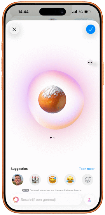 Tip: ook voor Oud & Nieuw kan je leuke Genmoji maken, zoals een oliebol met poedersuiker of jij met vuurwerk om je heen!