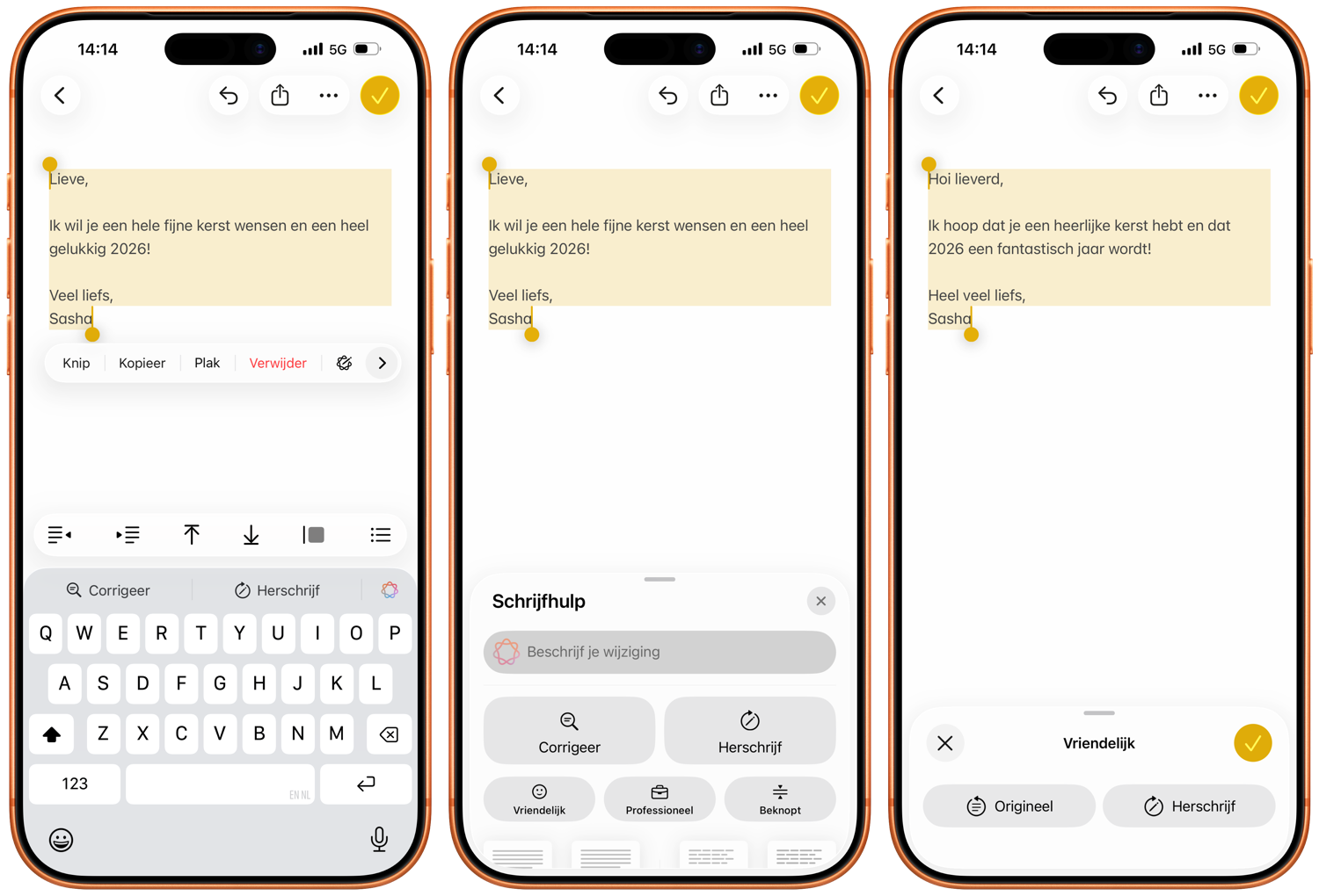 - Automatisch krijg je hier al Corrigeer, Herschrijf en het icoontje van Apple Intelligence te zien. Ook krijg je het pop-up menu, waarin je kan kiezen voor Apple Intelligence. Open Apple Intelligence Schrijfhulp.