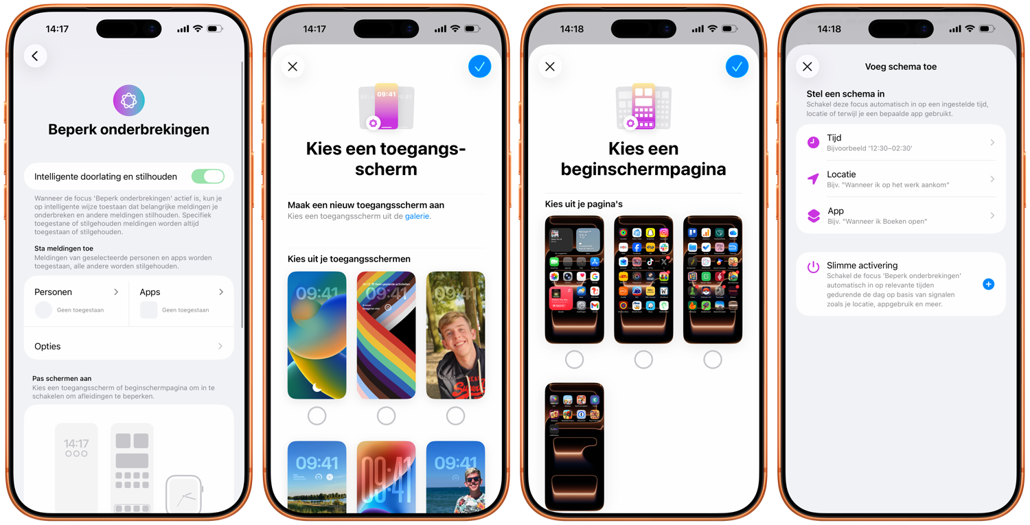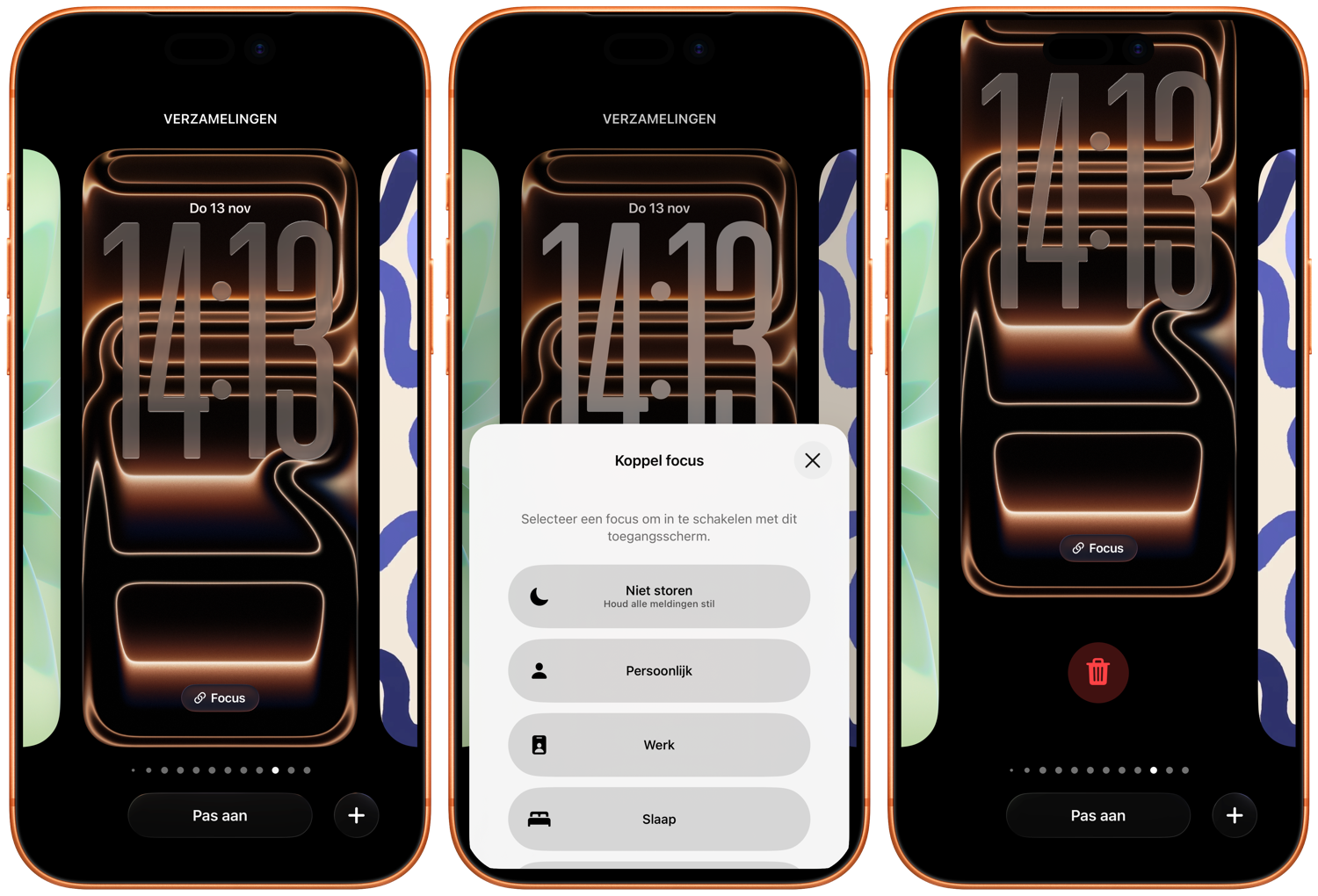 Een andere manier om een Focus te activeren, is om deze te koppelen aan een iPhone-toegangsscherm. Zodra je dan naar dit toegangsscherm wisselt, wordt automatisch de bijbehorende Focus-modus actief. Dit werkt ook andersom: activeer je de gekoppelde Focus-modus via bijvoorbeeld het Bedieningspaneel, dan wisselt je iPhone automatisch naar het bijbehorende toegangsscherm.