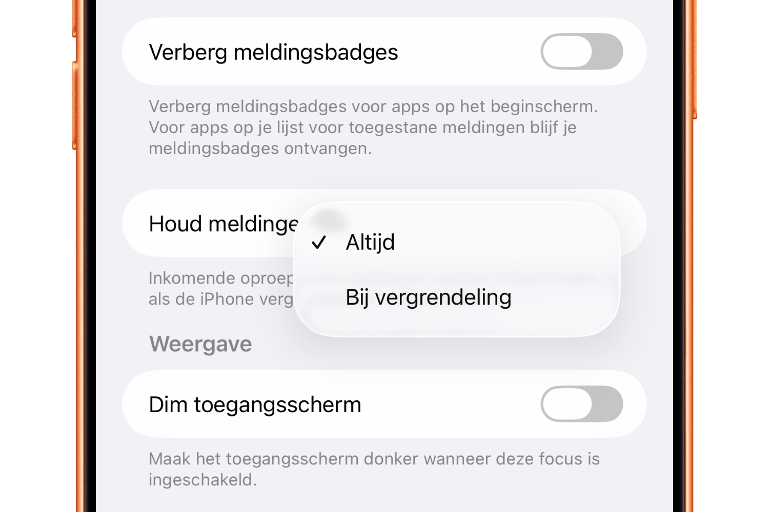 Je vindt deze instelling bij Instellingen > Focus > kies je Focus-mode > Opties > Houd meldingen stil.