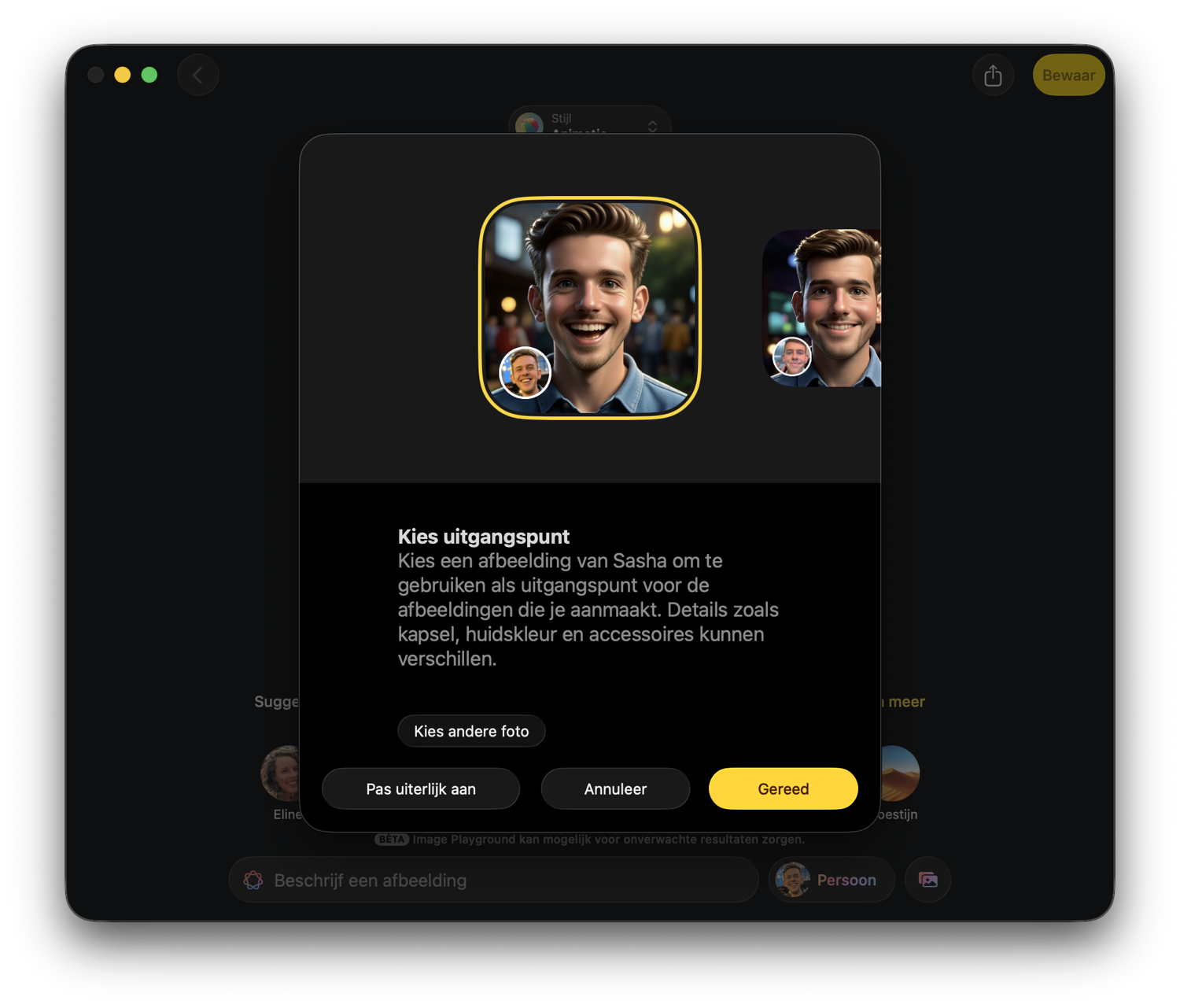 De app gebruikt hiervoor de personen uit de Foto’s-app, maar je kunt ook zelf een afbeelding kiezen via de knop rechtsonder. Kies je een van de voorgestelde personen, dan kun je ook het uitgangspunt kiezen als er meerdere foto’s van diegene in je fotobibliotheek staan. Wil je geen persoon gebruiken, omschrijf dan het voorwerp of onderwerp in het tekstveld.