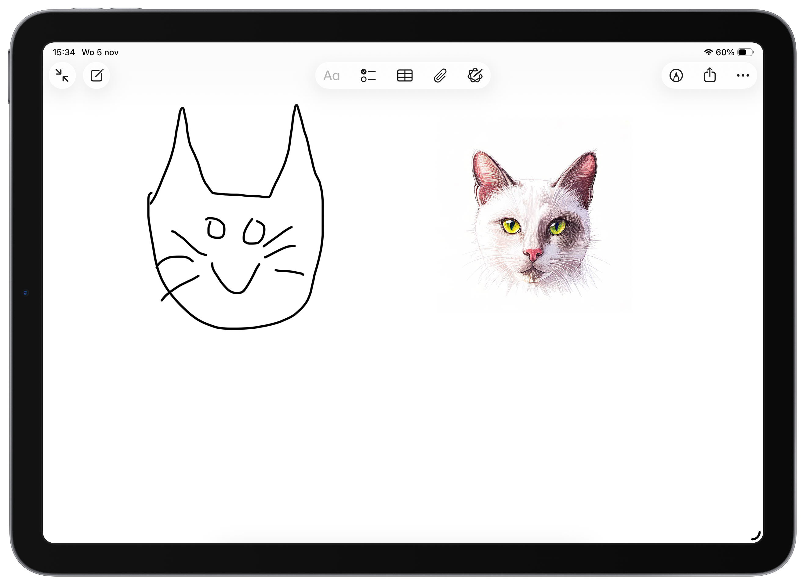 Gelieerd aan de Image Playground-functie is er ook de Image Wand-functie ingebouwd in de Notities-app. Daarmee kun je een grove schets die je met bijvoorbeeld je Apple Pencil in de Notities-app gemaakt hebt, omzetten in een door Image Playground-gemaakte afbeelding. Teken simpelweg cirkels met je vinger of Apple Pencil, waarna er een Image Playground toegevoegd wordt, waarbij al onderdelen ingevoegd zijn op basis van jouw eigen schets. Heb je bijvoorbeeld een schets gemaakt van een clown in een circus, dan worden onderdelen als “clown” en “circus” automatisch toegevoegd om de afbeelding te genereren.