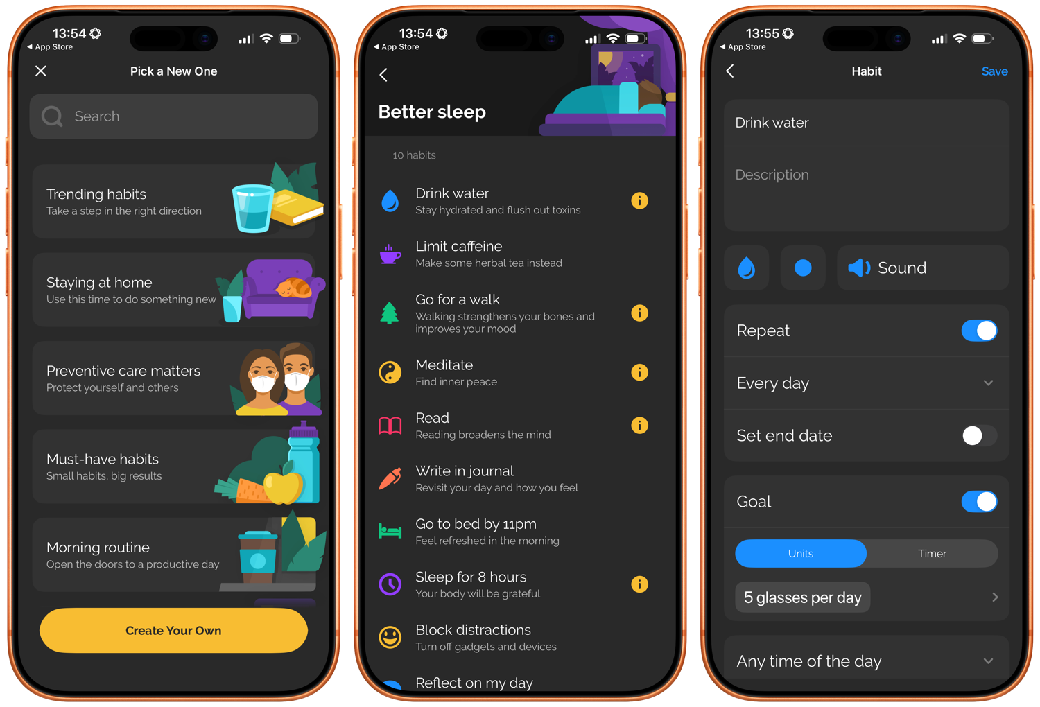 Done heeft ondersteuning voor Apple’s Gezondheid-app. Als je een wekelijks doel hebt om vier dagen per week vroeger op te staan, dan kun je het zo invoeren in de app. In het overzicht zie je hoe ver je met je doelen bent in een simpele voortgangsbalk. Zoals veel apps werkt Done ook met streaks om je bezig te houden. Gebruik je de app al een tijdje, dan zie je ook grafieken met je voortgang. Done is zowel bedoeld voor goede als slechte gewoontes. Verder is er een widget met je voortgang en kun je persoonlijke notificaties instellen.