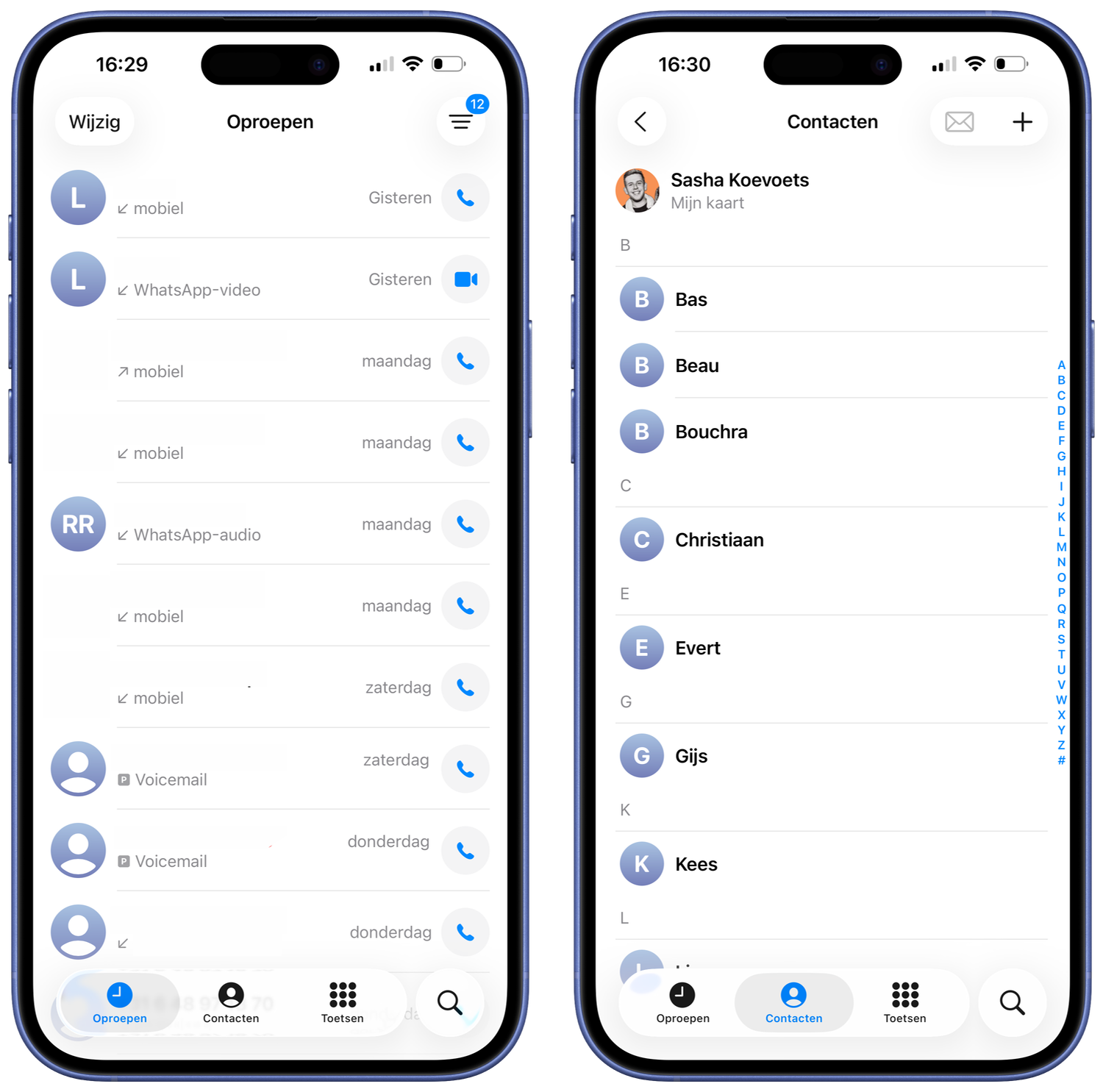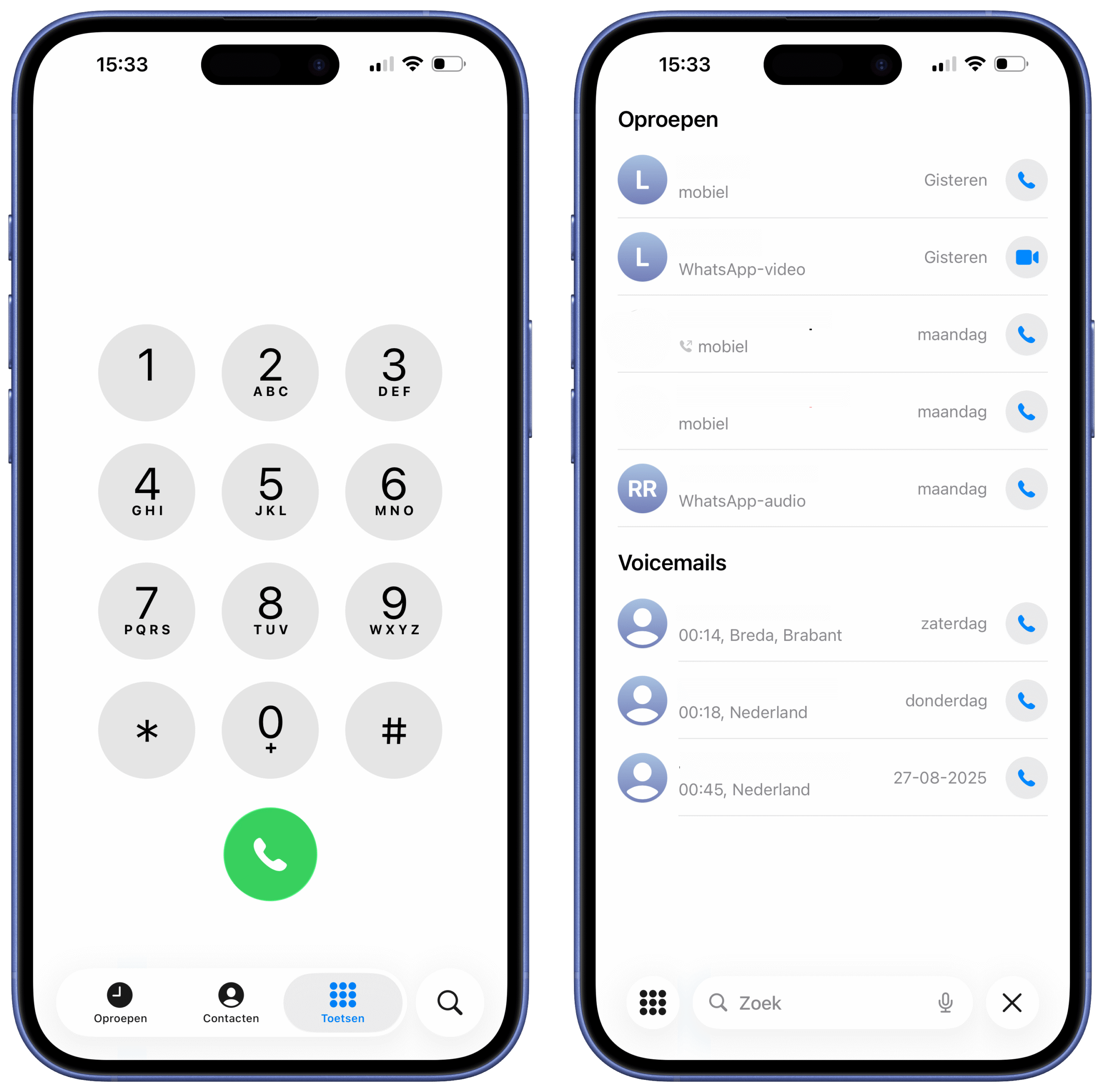 Het eerste scherm dat je ziet in de Telefoon-app is het Oproepen-tabblad. Dit overzicht toont al je recente telefoongesprekken – zowel inkomend als uitgaand – uit alle hiervoor geschikte apps. Ook gemiste oproepen verschijnen hier duidelijk in beeld, zodat je snel ziet wie je terug moet bellen. Eventuele voicemails die je hebt ontvangen worden eveneens in dit overzicht weergegeven, waardoor je meteen kunt doorklikken om het bericht af te luisteren. Favoriete contacten worden groot bovenaan getoond met hun iOS contactposter, als dat is ingesteld.