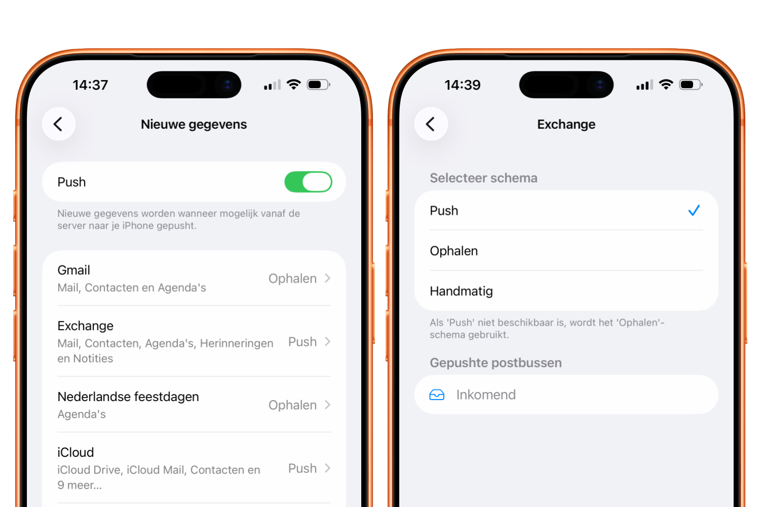 - Ook kun je zien dat Push/Ophalen/Handmatig ook in te stellen is voor agenda’s, notities en dergelijke.