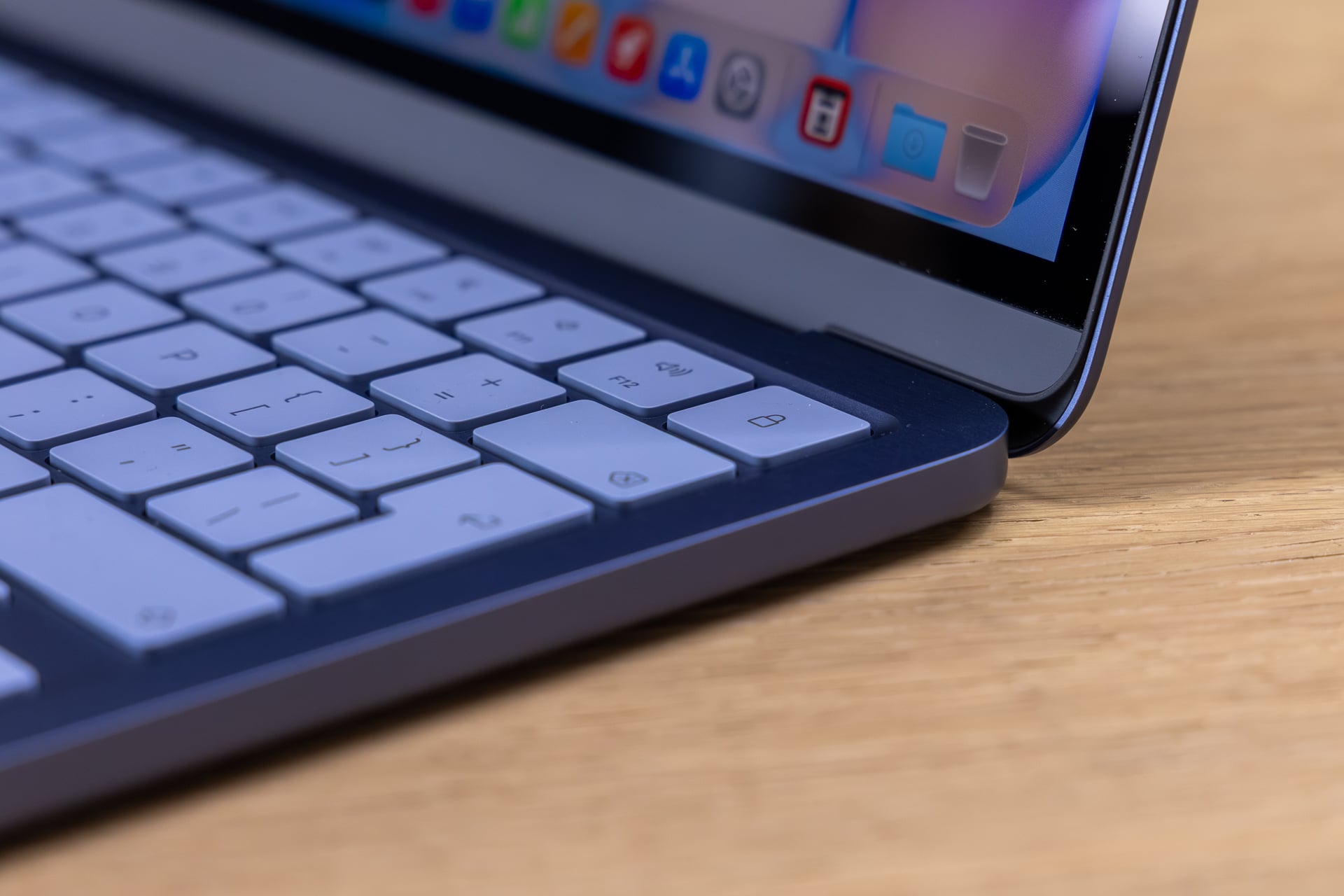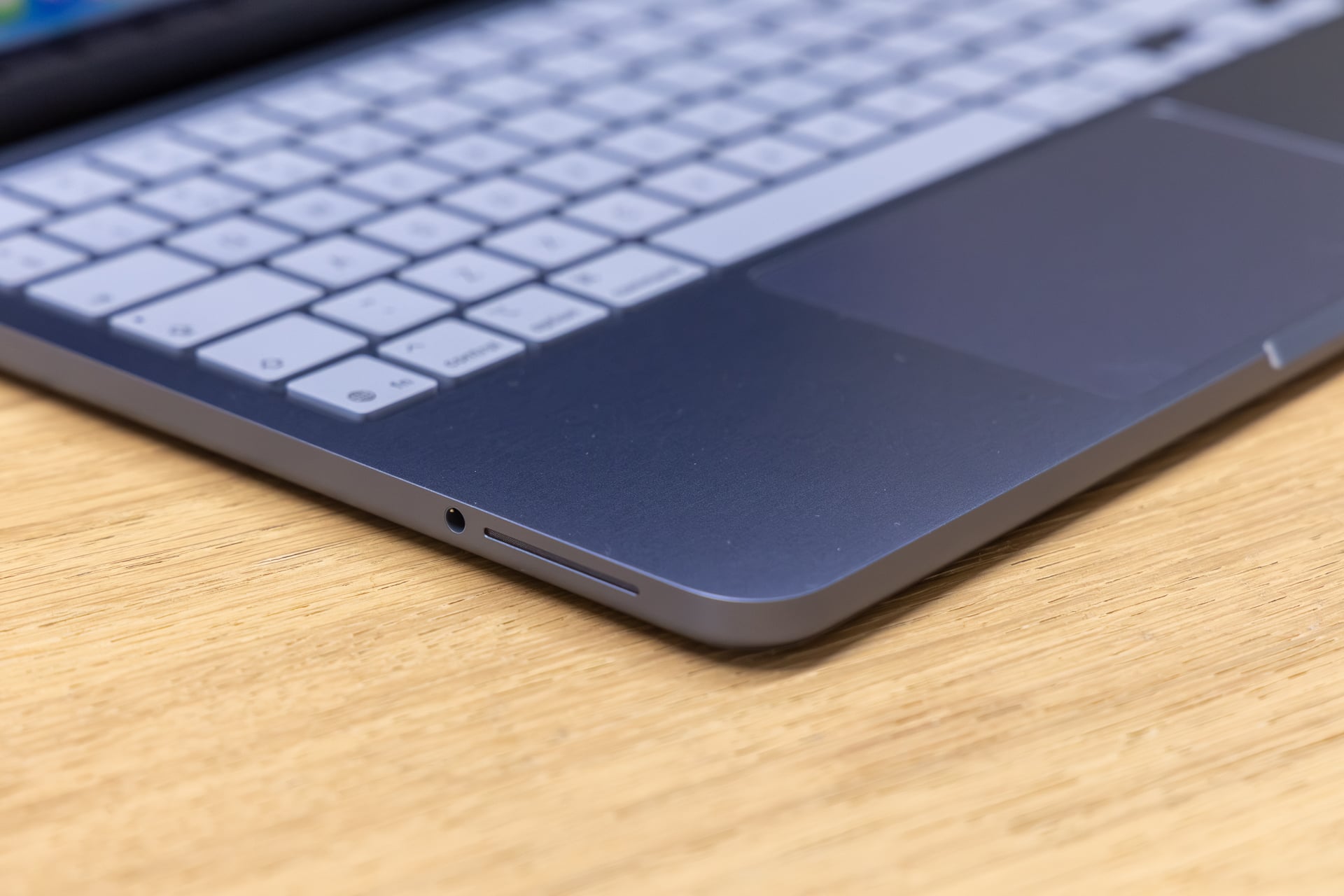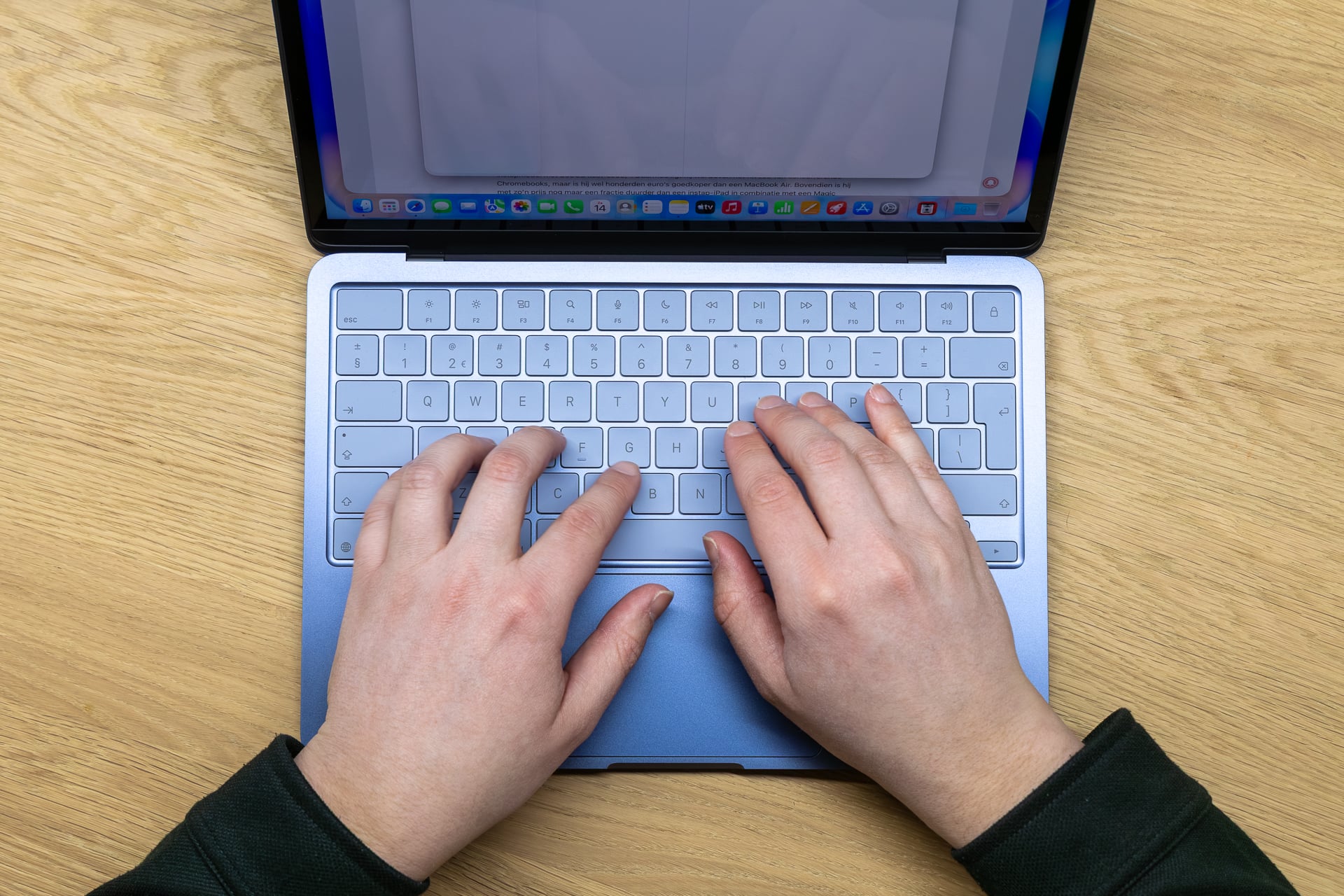 Normaal gesproken hebben MacBooks een zwart toetsenbord, maar bij de MacBook Neo is het toetsenbord passend gemaakt bij de rest van de behuizing. Bij onze blauwe MacBook Neo betekent het dat de toetsen een beetje lichtblauw zien. Het lijkt een beetje alsof de witte toetsen per ongeluk meegewassen zijn met een donkerblauwe spijkerbroek. Dat is niet per se negatief, al kunnen we ons voorstellen dat niet iedereen even gecharmeerd zal zijn van de lichtblauwe toetsen.