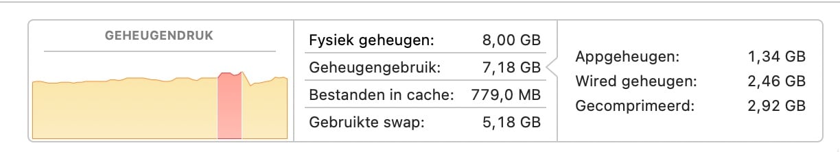 Tijdens het testen hebben we regelmatig de geheugendruk in de gaten gehouden. Nagenoeg constant was de geheugendruk gemiddeld, wat in de standaard Activiteitenweergave-app weergegeven wordt met een gele grafiek. De 8GB RAM wordt in ons werk eigenlijk de gehele dag continu gebruikt, waarbij er zogenaamd swapgeheugen wordt ingezet om het werkgeheugen uit te breiden. Dit is een deel van de ssd-opslag dat wordt ingezet als werkgeheugen.