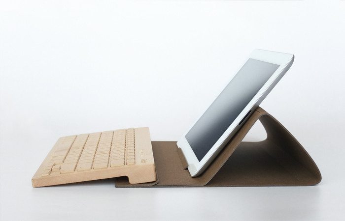 De Orée Board is een houten toetsenbord met Bluetooth, die je kunt gebruiken om teksten op je iPad te typen. Een bijbehorende hoes houdt je iPad omhoog.