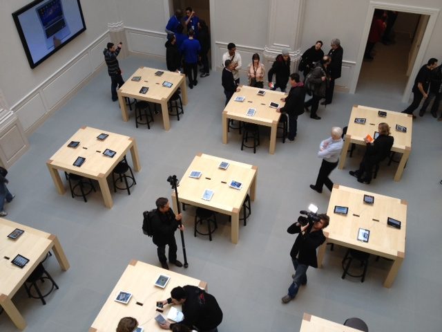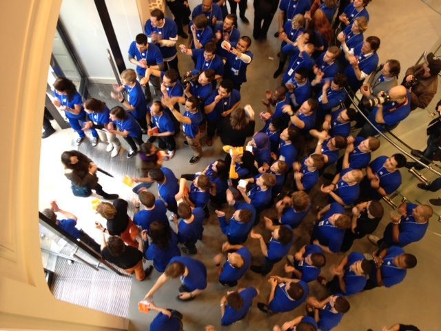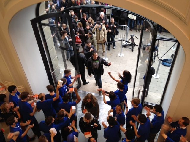 Vlak voordat Apple de deuren opentrok rende het personeel al juichend langs de rij, de handen van de wachtenden aantikkend. Na de opening werd iedere klant vervolgens door juichende personeelsleden opgewacht, die een pad door de winkel heen vormden. Het geklap en gejuich hield minstens anderhalf uur na de opening nog aan terwijl wachtende klanten langzaam maar zeker naar binnen werden geholpen.