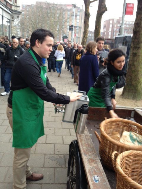Gisteravond zagen we al dat de eerste bezoeker van de Apple Store plaats had genomen in de rij. Een Duitse Apple-fan was om 18:20 voor de winkel gaan zitten. Een paar uur voordat de Apple Store opende, groeide de rij aanzienlijk: een half uur voor aanvang reek de rij tot ver achter het winkelpand. Omringende winkels speelden hier slim op in: Starbucks deelde koffie uit aan wachtende klanten, ABN Amro gaf een appeltje voor de dorst en Mini feliciteerde Apple met zijn aankoop met een speciale wagen.