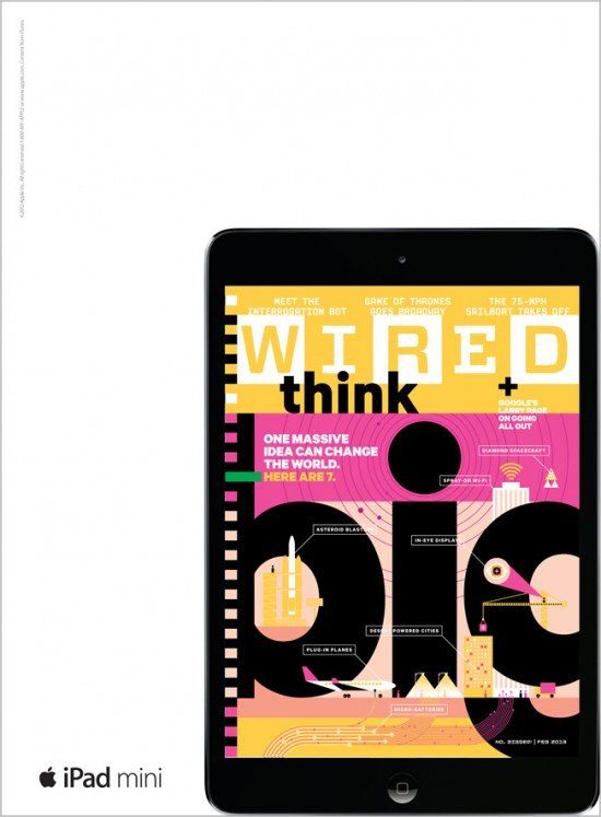 iPad mini Time Magazine reclameApple heeft de Grand Prix-reclameprijs in de categorie print gewonnen op het Cannes Lions International Festival of Creativity. De prijs werd uitgereikt voor een paginavullende advertentie op onder andere de achterkant van het tijdschrift Time. De reclame liet op slimme manier zien dat je de iPad prima als tijdschriftlezer kunt gebruiken, door de frontcover van datzelfde nummer van Time op een iPad mini-scherm te laten zien. De advertentie verscheen naast Time ook in in New Yorker, Surfer, Time, Wallpaper en Wired.