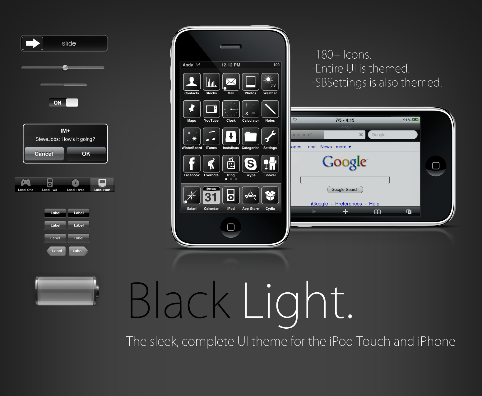De repo’s in Cydia puilen uit van de eigengemaakte thema’s en achtergronden. Af en toe duikt er een juweeltje op die de moeite van het bekijken waard is. Zo ook Black Light, een uiterst stijlvol vormgegeven Winterboard-thema dat alleen van grijstinten gebruik maakt. Wat dit thema zo bijzonder maakt is dat het uiterst compleet wordt afgeleverd. Zo past Black Light het homescreen, lockscreen, applicaties en zelfs SBSettings aan. Het thema heeft aangepaste iconen voor maar liefst 180 applicaties en is bedoeld voor gebruik met Five Column Springboard en Five-Icon Dock.