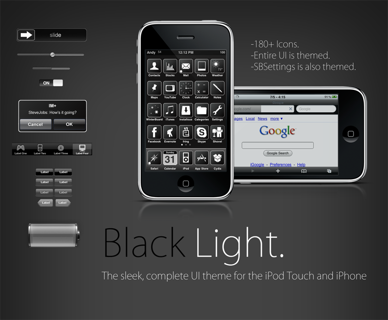 Hoewel het thema eigenlijk ontworpen is voor de iPod touch beweert de maker, dat het thema ook prima werkt op de iPhone. Het thema is ontworpen voor gebruik met Categories, Five Column Springboard, Five-Icon Dock en MobileMusic Flip (MMP Flip in Cydia). Voor de beste resultaten moet je deze packages dus eerst even installeren. Vervolgens zoek je in Cydia naar Black Light en Black Light SB. Beide packages zijn in de standaard aanwezige ModMyI-repo te vinden.