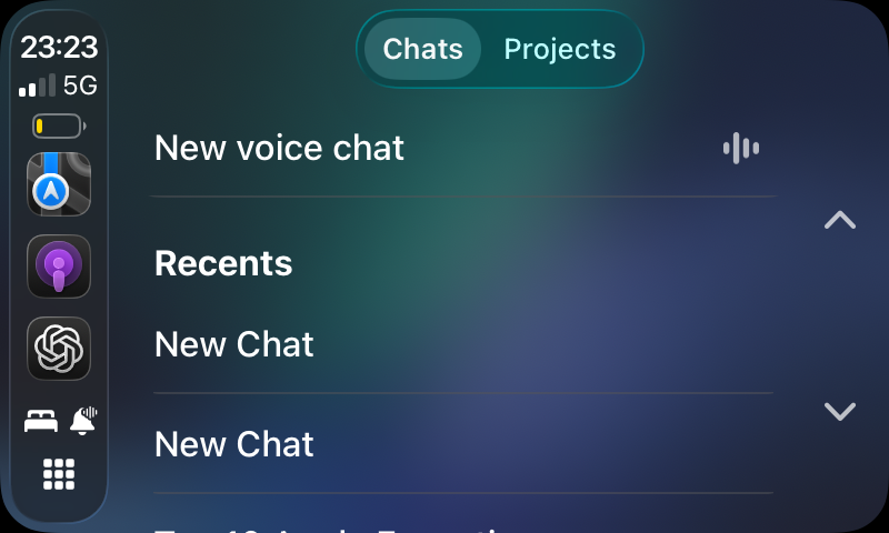 Met de nieuwste update van de ChatGPT-app verschijnt de app ook op je CarPlay-scherm. Dit is mogelijk dankzij iOS 26.4, de nieuwste update waarin Apple het mogelijk maakt voor AI-apps met spraak om een CarPlay-versie uit te brengen. Zodra je de app op CarPlay opstart, zie je een lijst met recente gesprekken die je met ChatGPT gehad hebt. Je kunt hier op tikken om binnen deze conversatie opnieuw te praten, zodat je dit later kunt teruglezen op je iPhone. Maar je kunt natuurlijk ook een nieuw gesprek starten.