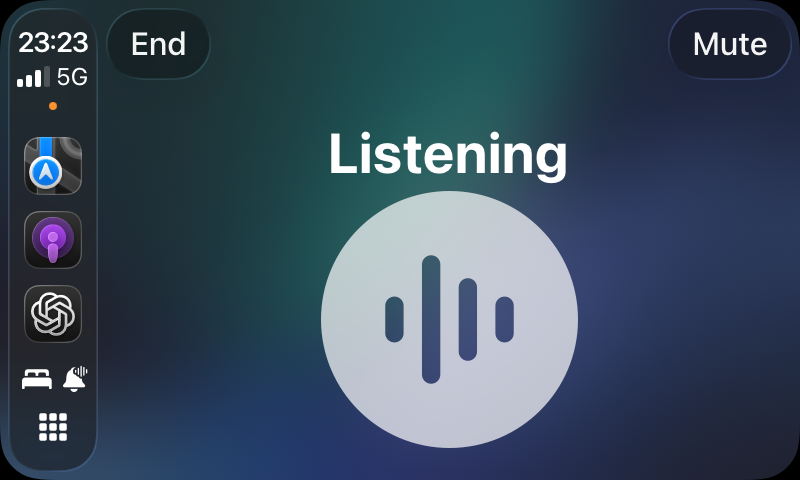 Zodra je met ChatGPT praat, verschijnt er op het scherm een grote luisteren-knop die aangeeft dat je kan beginnen met praten. Zodra je stopt met praten, geeft ChatGPT automatisch antwoord op hetgeen je gezegd hebt. Op die manier kun je dus in de auto een gesprek voeren. Dit werkt ook nadat je de app afgesloten hebt, zolang je maar niet op de End- of Mute-knop gedrukt hebt. Het oranje bolletje in de zijbalk geeft aan dat de app blijft luisteren.