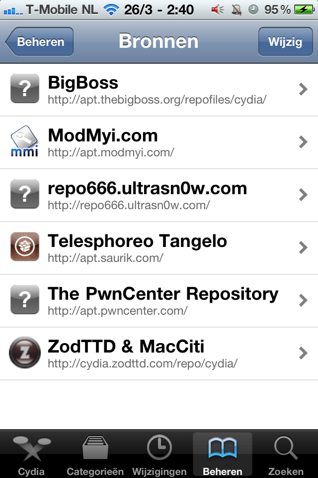 Wand ik als ik kijk bij sources (ja sorry ben nog even de engelse cydia gewoon) dan staan ze inderdaad nog (Bigboss source) –> en daarin zitten de sources ook nog in wat wij bedoelde.