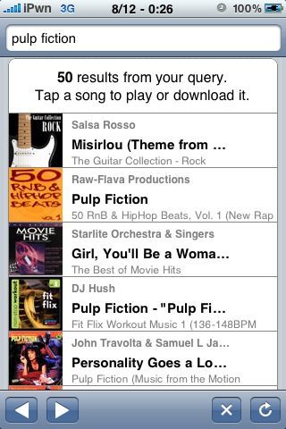 Om gebruik te maken van iRingtones heb je de Safari Download Plugin nodig. De werking van de applicatie is in principe eenvoudig en wijst zichzelf. Je kunt op een bepaalde titel zoeken met behulp van het bovenste tekstveld. Vervolgens zullen er maximaal 50 resultaten getoond worden voor je zoekopdracht. Selecteer dan een bepaalde ringtone en kies er daarna voor om deze ringtone direct te downloaden of eerst af te spelen.