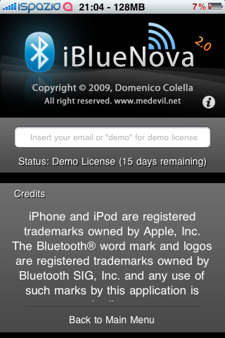 iBlueNova is voor $5,99 beschikbaar via de repository van iSpazio. Als je iSpazio niet ingesteld hebt kun je deze toevoegen via www.ispaziorepository.com. Je kunt de iBlueNova applicatie 15 dagen gratis proberen. Als je eerder iBluetooth hebt gekocht, zou je de licentie daarvoor ook voor iBlueNova moeten kunnen gebruiken.