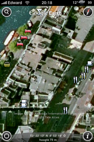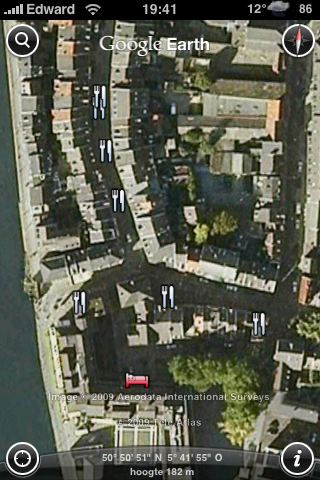 Google maakte zojuist op haar officiële Google Earth and Maps-blog bekend dat de Google Earth-applicatie voor de iPhone er vanaf nu een nieuwe laag heeft bijgekregen. Deze ‘businesses’-laag bevat allerlei informatie over restaurants, bars, banken, tankstations en supermarkten. Wanneer je ver genoeg inzoomt op de kaart zie je vanzelf icoontjes verschijnen van deze verschillende zaken. Klikken op het betreffende icoon geeft meer informatie zoals adres, telefoonnummer, website maar ook bijvoorbeeld recensies van iens.nl over het betreffende restaurant. Erg handig dus! Bij het testen van deze nieuwe feature op onder andere de stad Maastricht ben ik vooralsnog geen informatie tegengekomen over banken, tankstations en supermarkten maar in bijvoorbeeld Amsterdam was dit al wel het geval.