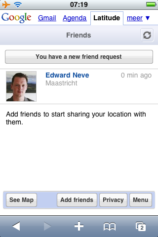 Gebruik dit al een poos met de G1, zou wel fijn zijn als er ook een shout out functie (push) voor de iPhone komt, maar vraag me af of dit met de webapplicatie kan, had een applicatie of een functie in Maps toch handiger gevonden.