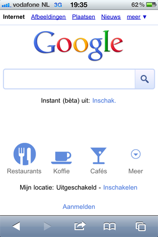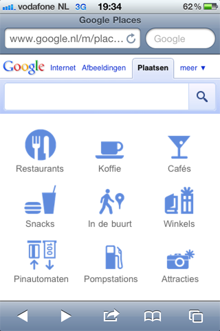 Links naar Google PlaatsenGoogle heeft zijn homepage voor de iPhone weer een kleine update gegeven. Dat heeft het internetbedrijf bekend gemaakt tijdens het evenement Inside Search. Als je nu naar Google.com gaat, krijg je naast de gewone zoekbalk vier knoppen te zien: Restaurants, Koffie, Cafés en Meer. Deze links bieden toegang tot Google Plaatsen (Places in het Engels), waarmee je kan zoeken naar horeca, tankstations, winkels en meer handige locaties in de buurt.