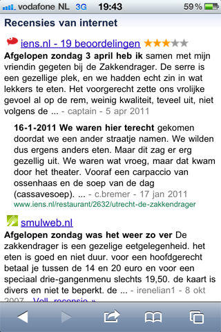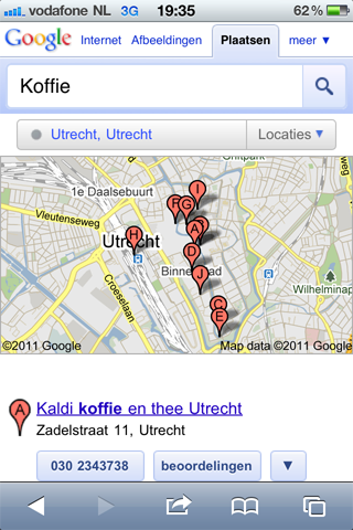 Het zoeken naar Plaatsen gebeurt in principe op basis van je huidige locatie, maar het is ook mogelijk een adres in te vullen om ergens anders te zoeken. Vanuit de resultaten kun je direct doorklikken naar beoordelingen, waarmee je reviews kan lezen op sites als IENS. Ook is het mogelijk om om met één klik een routebeschrijving op Google Maps te krijgen vanaf je huidige locatie. Reserveren bij een restaurant? Met één klik bel je het restaurant.
