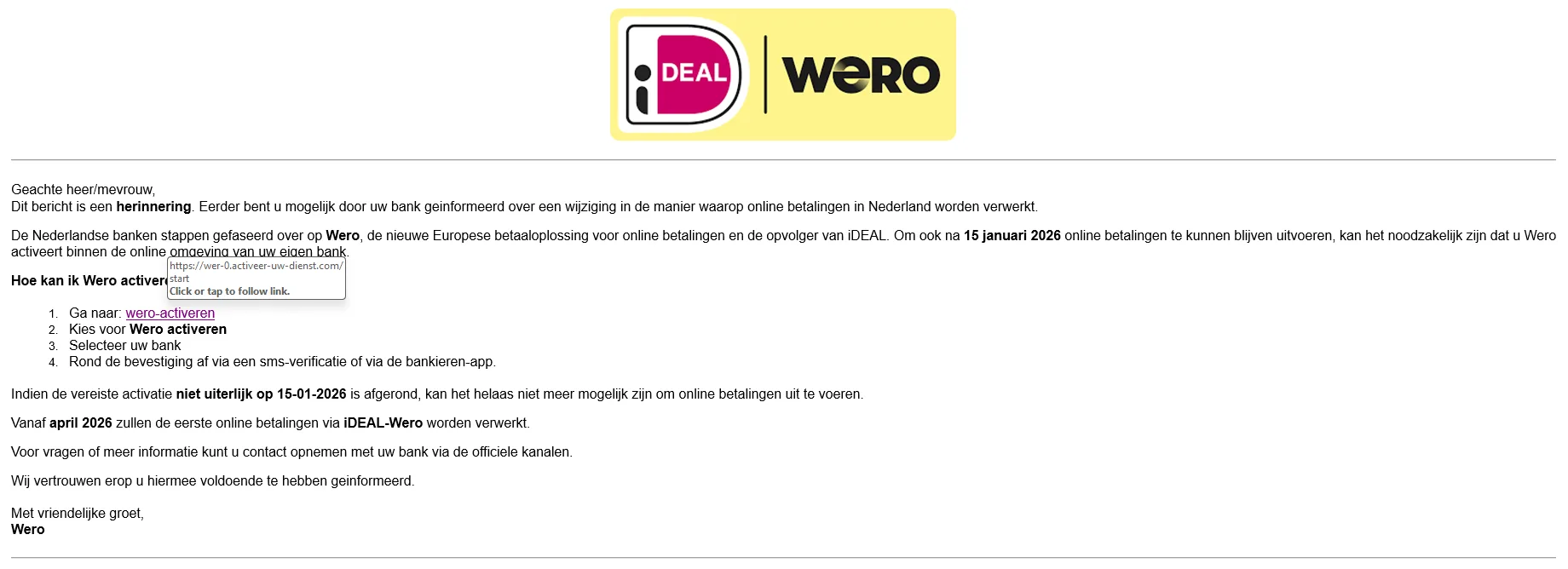 Phishing uit naam van iDEAL is helaas niets nieuws. Sterker nog: iDEAL heeft een hele pagina op haar website waarin gewaarschuwd wordt voor nepmails waarin opgeroepen wordt om “jezelf te verifiëren” of andere handelingen te verrichten. Maar met de komst van Wero, de vervanger van iDEAL, lijkt er weer een nieuwe storm van iDEAL-phishing onze kant op te komen. Maar ook Wero zelf lijkt het scammers wel erg makkelijk te maken.