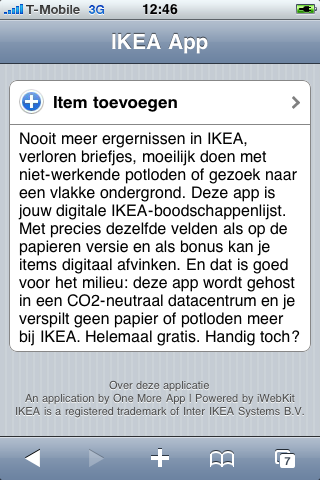 Mooi vervelend dat het een web-app is. In Ikea Groningen heb ik nul komma nul bereik. Waardeloos als web-app dus. Daarnaast is een notitie maken prima, en hoe kun je nu zo’n klein briefje kwijtraken in de Ikea? Je bent daar toch maar een uurtje? Maar goed. Leuk bedacht iig.