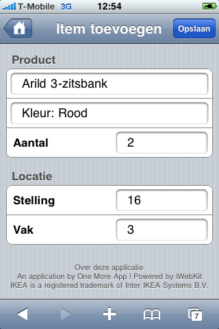 Daarom heeft ontwikkelaar One More App een webapplicatie ontwikkeld: IKEA App. In deze webapplicatie heb je de beschikking over een lijstje waaraan je producten kan toevoegen. Je kan o.a. aangeven om welk product het gaat, hoeveel je van dat product wil en welk magazijnnummer er bij hoort. Je zult wel zelf alles moeten typen.