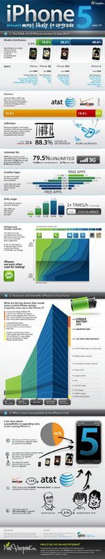 Apple gaat sinds lange tijd weer een nieuwe iPhone uitbrengen. Daarom twee infographics, die interessante inzichten geven. Zo blijkt dat slechts 4% van de huidige iPhone-bezitters zit te wachten op een toestel met een nieuw design. De ene infographic brengt de huidige gebruiker van de iPhone in beeld en laat zien hoe je huidige iPhone bepalend is voor de iPhone die je straks koopt. De andere infographic zet de geruchten over de iPhone 5 weer eens goed op een rijtje.