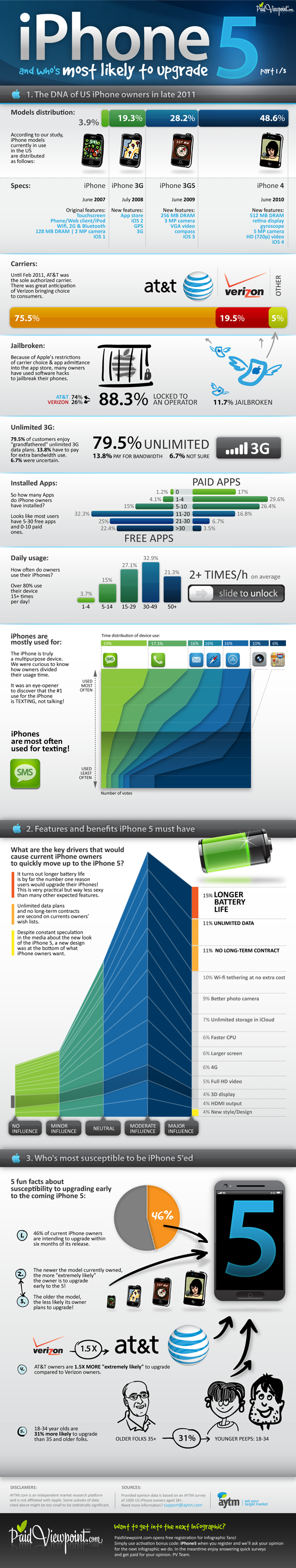 Interessanter is natuurlijk wie een iPhone 5 gaan kopen. Dit blijkt afhankelijk van het toestel dat mensen nu al hebben. Hoe nieuwer de iPhone, hoe meer kans dat iemand de iPhone 5 gaat kopen. Bezitters van de eerste generatie iPhone zijn dan ook het minst geneigd om te upgraden. Waarom toch een nieuwe kopen, terwijl de oude nog prima presteert? De ondervraagde mensen geven aan dat ze een langere batterijduur verwachten (15%), liever een onbeperkt dataplan hebben (11%) of willen overstappen naar een korter abonnement (11%). Slechts 4% zit te wachten op een iPhone met een nieuw uiterlijk. Nog een leuk feitje: de iPhones worden vooral gebruikt om te sms’en.