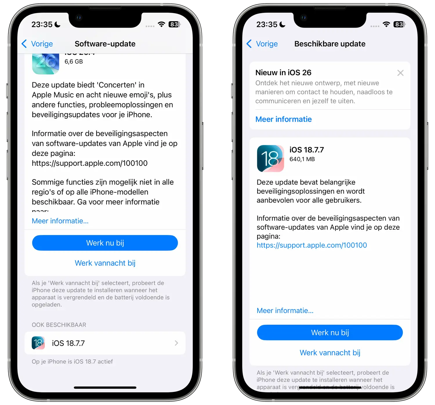 De nieuwe versie van iOS 18.7.7 heeft buildnummer 22H340, terwijl de vorige versie nog als buildnummer 22H333 had. Op deze pagina lees je meer over de andere beveiligingsverbeteringen van de update.