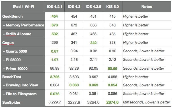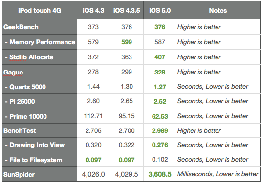 Voor de benchmark werd gebruik gemaakt van Geekbench, dat we eerder nog voorbij zagen komen toen de eerste benchmarks van de iPhone 4S naar buiten druppelden. GigaOM gebruikte verschillende versies van iOS 4 en iOS 5 op verschillende apparaten, om de prestaties vervolgens naast elkaar te zetten in onderstaande tabellen. Opmerkelijk is dat iOS 5 als beste uit de test komt voor de iPhone 4, iPod Touch vierde generatie en iPad 2, maar dat hij op de iPad 1 op sommige vlakken slechter presteert. Een benchmark van de iPhone 3GS lijkt te ontbreken.
