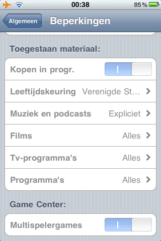 - In de beperkingen kun je nu instellen dat de gebruiker geen multiplayer-games via Game Center mag spelen.