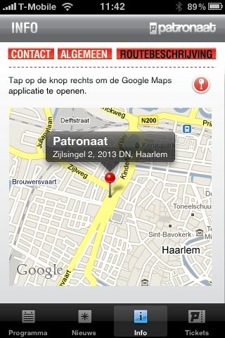 Het Haarlemse Patronaat stuurde ons een persbericht over een nieuwe Nederlandse iPhone-applicatie: iPatro. De applicatie geeft informatie over geplande concerten, het laatste nieuws, een routebeschrijving via Google Maps en contactinformatie. Het Patronaat ziet de applicatie vooral als marketinginstrument, maar je kunt er ook praktische dingen mee doen, zoals het bestellen van concertkaarten via een mobiele webpagina. De reden om voor de iPhone te kiezen, was omdat de iPhone goed is voor tweederde van het mobiele internetverkeer.