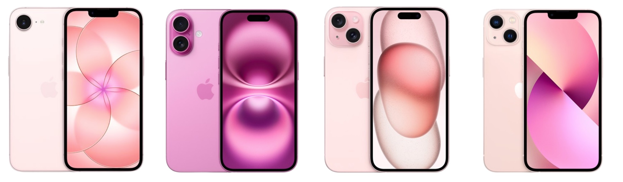 De roze iPhone 17e lijkt nog het meest op de roze iPhone 15, maar dan nog net een stukje zachter en dichter naar wit toe. In onderstaande afbeelding zie je alle recente roze iPhones naast elkaar: iPhone 17e, iPhone 16, iPhone 15 en iPhone 13. Van de iPhone 14 is geen roze variant verschenen. De iPhone 13 in het roze is het donkerste van allemaal, waarbij de iPhone 15 in roze wat lichter is. De iPhone 17e doet daar nog een schepje bovenop door de tint nog lichter te maken. Vandaar dat Apple ook voor de naam zachtroze gekozen heeft. Het buitenbeentje is de iPhone 16 in roze: die is echt een stuk feller dan de rest.