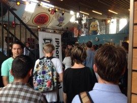 - De rij voor de zaal. Alsof er binnen een nieuwe iPhone werd verkocht.