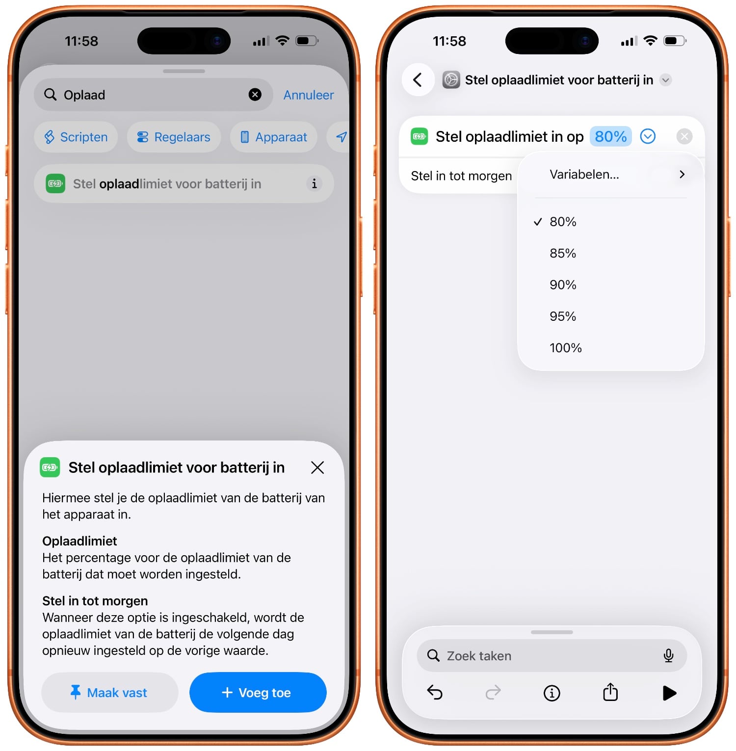 Naast de komst van deze functie in macOS wordt het met iOS 26.4 en macOS 26.4 ook mogelijk om de oplaadlimiet te automatiseren via de Opdrachten‑app. Je kunt bijvoorbeeld een opdracht maken die het limiet verlaagt als je meerdere uren aan je bureau werkt, of juist tijdelijk op 100 procent zet vlak voordat je met je MacBook op pad gaat. Daarnaast kan je dit eenvoudig in- of uitschakelen door middel van een spraakopdracht, in plaats van dat je door de instellingen hoeft te zoeken.