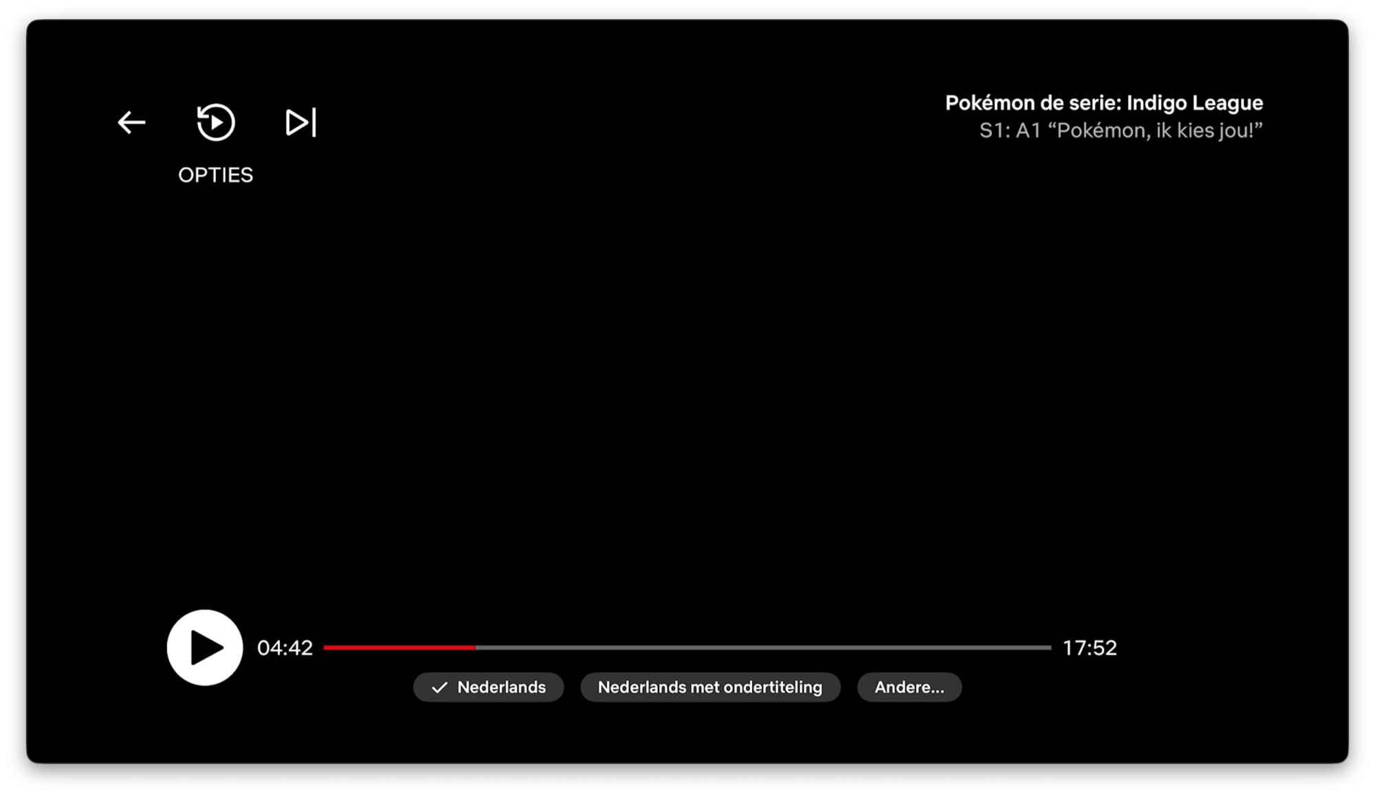 De nieuwe videospeler van Netflix op de Apple TV ziet er niet alleen minder mooi uit, maar heeft ook wat overbodige knoppen. Zo vind je linksboven een knop om terug te gaan en de video af te sluiten, terwijl de Apple TV-afstandsbediening zelf al een terugknop heeft. Daarnaast vind je nog knoppen om de video opnieuw af te spelen of naar de volgende aflevering te gaan. Onderin beeld vind je de tijdbalk, waar je op twee manieren doorheen kan scrollen. Door op de buitenste knoppen van de ring op de Apple TV-remote te drukken, kun je tien seconden vooruit of achteruit bladeren. Maar de video wordt daarbij meteen gepauzeerd, waardoor je weer op afspelen of bevestigen moet klikken.