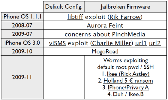 In de presentatie geeft Seriot eerst een overzicht van de historie van privacy-problematiek op de iPhone en iPod touch. Uit het overzicht blijkt dat de risico’s voor wél en niet gejailbreakte iPhones en iPods gelijk op gaan, met uitzondering van de risico’s die ontstaan als gebruikers zelf na het jailbreaken een SSH-service (bedoeld om op afstand op de iPhone in te loggen) installeren zonder het standaard wachtwoord te veranderen. Seriot bestrijdt in de presentatie de uitspraak van Sophos dat de iPhone daarom niet klaar zou zijn voor het gebruik in een bedrijfsomgeving met de woorden: