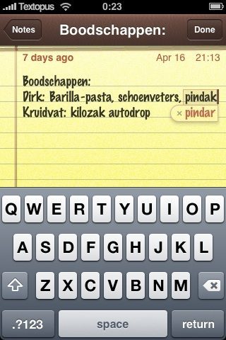 Tot zover de theorie. Natuurlijk hebben we het ook even uitgeprobeerd op een iPhone waarop al T9 geïnstalleerd was. Na het installeren schakel je alle toetsenborden uit, ook de Engelse en de Nederlandse. Je schakelt alleen English (UK) in. Helemaal vlekkeloos blijkt iPhoneDict bij ons toch nog niet te werken. Typisch Nederlandse woorden zoals pindakaas, poldermodel en klompendans worden niet herkend en het woordenboek doet ook geen suggesties die enigszins in de richting gaan, zoals polder of klomp. Iemand wel succes? Laat het weten in de reacties!
