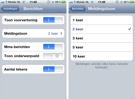 iPhoneclub-lezer Johan Brems weet via e-mail te melden dat er een nieuwe optie bij Instellingen > Berichten is verschenen, met de naam ‘Meldingstoon’. Deze optie vervangt de optie ‘Herhaal melding’ in eerdere firmwareversies. Met de nieuwe optie kun je aangeven hoe vaak de melding voor nieuwe (sms-)berichten moet verschijnen, met als mogelijke opties: 1x, 2x, 3x, 5x en 10x.